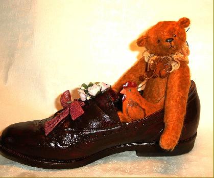 Nino 16 cm 6,3" Nino is made of gold antique style Schulte mohairwith glass eyes and a waxed nose. His has antiqued ultra suede paw pads and he wears a neck ruff from vintage lace. He sits in an old children's shoe and he comes with his little rusty chicken toy. 145 € (182 US $) plus shipping |