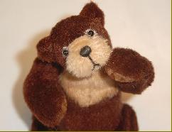 Sunny is a bit reminiscent of a Malaysian sun bear. He is just a tiny bit over 3" tall and he is also made of this wonderful new „cashmere-type" fabric that has this dense and nice mat quality. Sunny has onyx bead eyes with handpainted white accents around. He has a. embroidered and waxed nose and like all my bears he is stuffed with sheep's wool and steel pellets. He also has wired arms for more poseability. His ultrasuede paw pads are handpainted. Sunny is 155 € (189 US $) plus shipping |