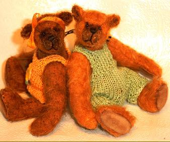 Janine (left) and Jerome each 8 cm, 3,2" Onyx eyes, waxed noses. Jerome is made from gold antique Schulte mohair, Jannine is made from a hazelnut colour mohair in the same style . Jerome wears handknit cotton pants, Janine wears a handknit cotton top. Each 175.- US $ (145.- EUR) plus shipping |