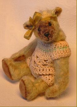 Hattie 9 cm, 3,5" Is made from a pale mint green antique style Schulte mohair with hand painted features. Glass eyes and waxed nose. Hattie wears a silk ribbon and a handcrochet cotton romper. 175.- US $ (145.- EUR) plus shipping |